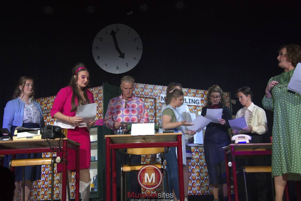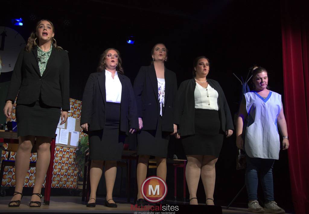 Dat laat Caecilia zich geen tweede keer zeggen. Samen weten de spelers het verhaal met verve over te brengen. Indrukwekkend is hoe deze productie op een relatief klein podium met een twintigkoppige cast de verschillende locaties van het verhaal tot leven wekt. Dat doen de spelers zowel figuurlijk – het kantoor oogt te allen tijde levendig door (de interacties tussen) het ensemble – als letterlijk – de changementen van veelzijdige decorstukken zijn strak gecoördineerd. Zowel de fijne scenografie als de groepsperformance bereiken hun hoogtepunt rond “Doe Het”. Terwijl de medewerkers het kantoor opfleuren met personalia, zingen ze de optimistische liedtekst met overtuiging. Een aantal spelers voert hier choreografie uit die goed aansluit bij de gelimiteerde ruimte op het podium.
