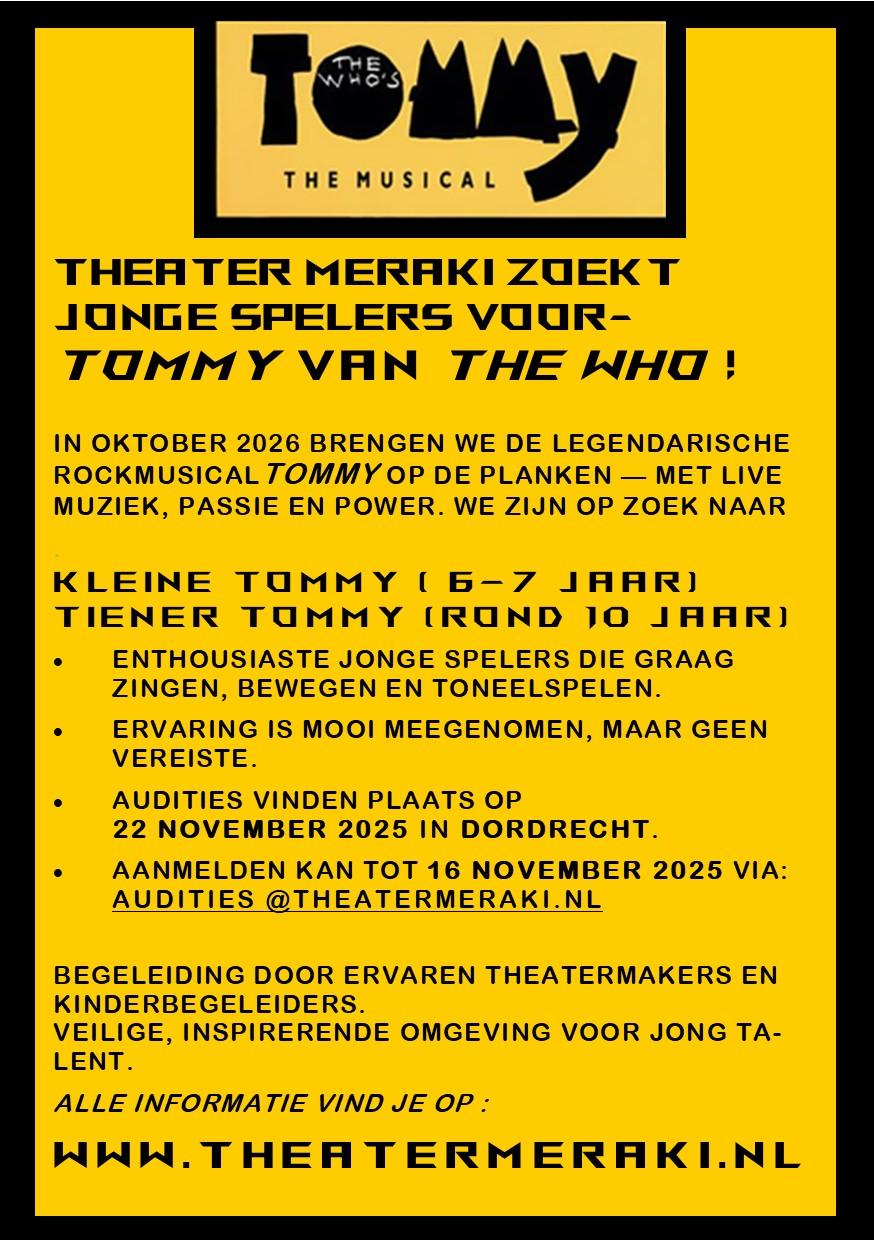 Meraki zoekt jonge spelers voor de rollen van Kleine Tommy (~6 jaar) en Tiener Tommy (~10 jaar).