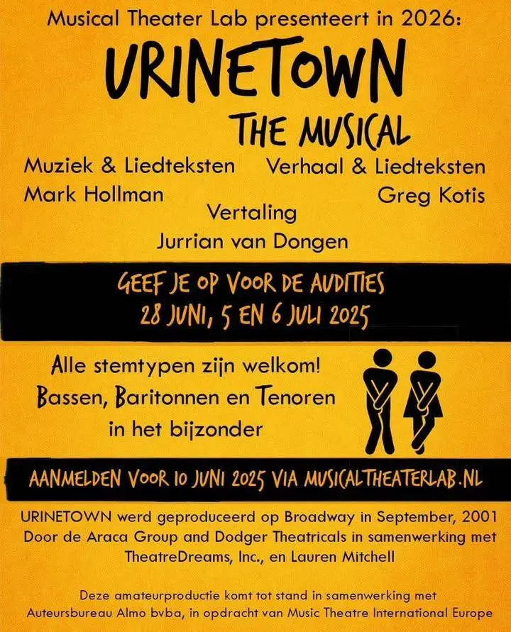 In 2026 speelt Musical Theater Lab de productie Urinetown en er zijn audities voor deze amateurmusical bij Muscaltheaterlab.