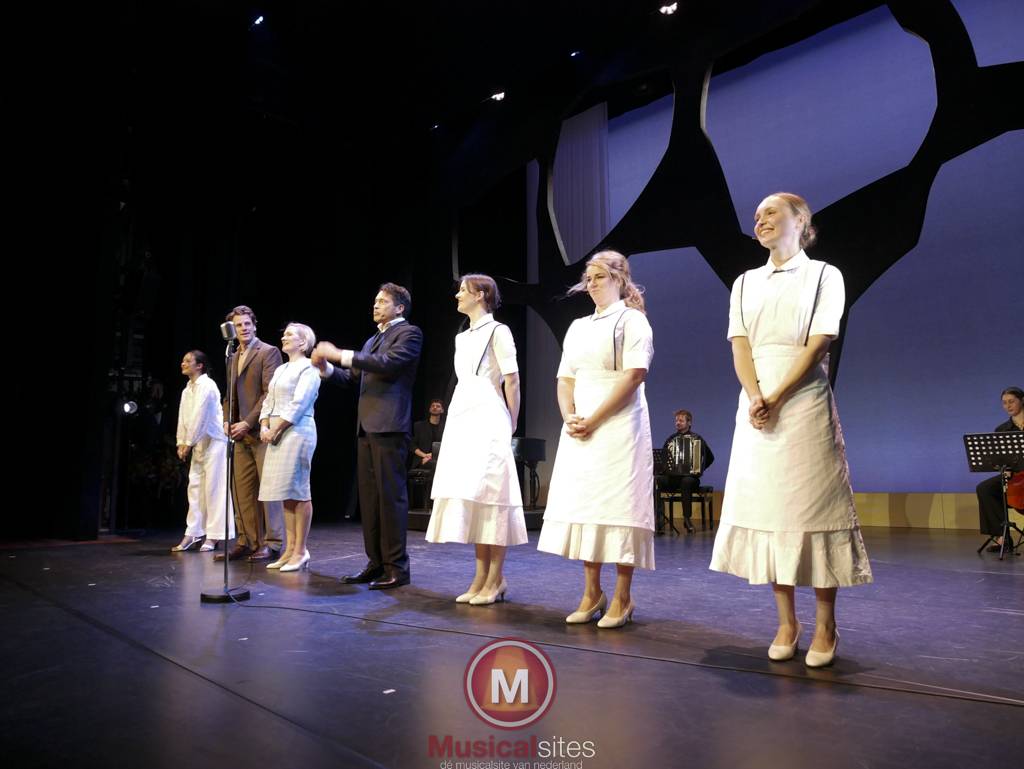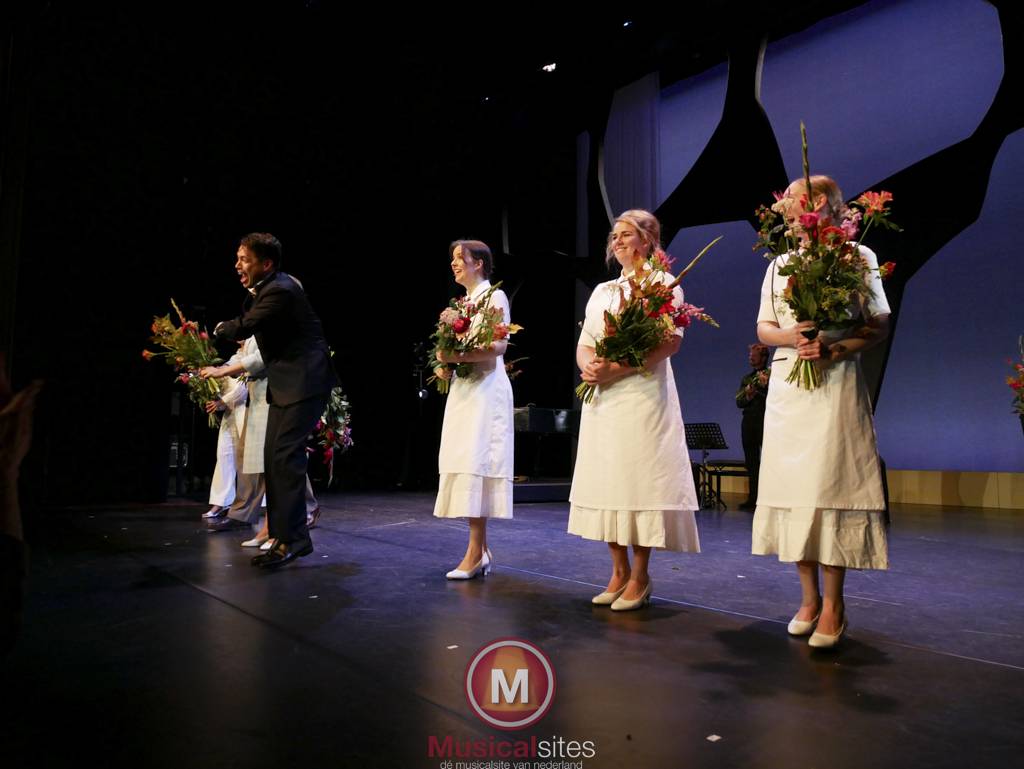 Nog een geweldig trio waren de dames die de “overige rollen” speelden, maar af en toe als een bijna Andrew Sisters-achtig geheel een paar liederen kwamen brengen die je zo in de jaren 50 à 60 terugbracht. Lena Stallinga, Rijanne Mink en Jasmijn Veerman zijn in deze stijl goed op elkaar ingespeeld, de stemmen zijn écht in harmonie.