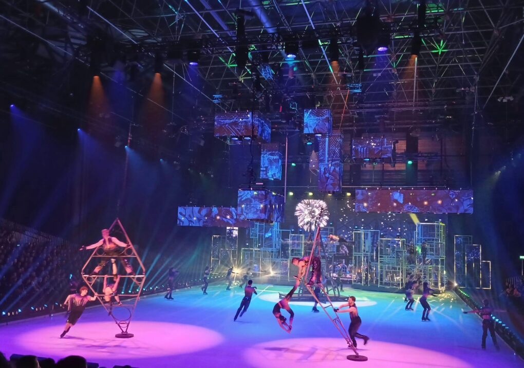 Er wordt niet alleen geschaatst, in de show zit ook nog de nodige acrobatiek die wordt verzorgd door diverse mensen zonder schaatsen. Een acrobaat op een éénwieler, die daarbij ook nog eens jongleert en met vuur rondzwaait, maar ook acrobatiek aan banden en kettingen die aan het plafond hangen. Het past prima in de voorstelling en is mooi om naar te kijken.