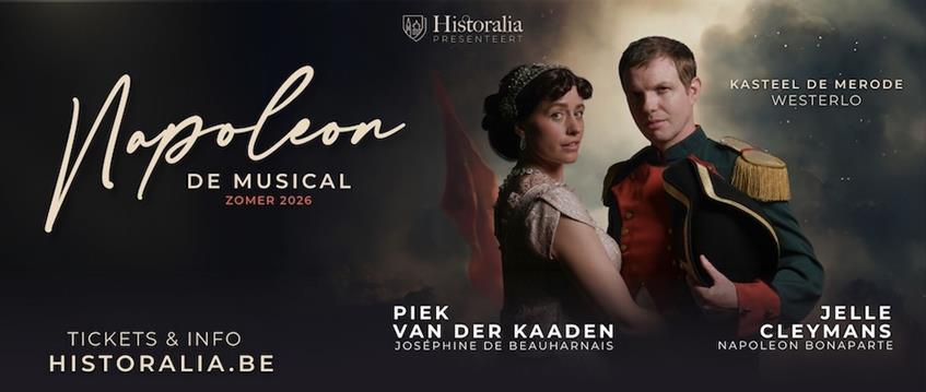 In de zomer van 2026 zal er met ‘Napoleon’ een gloednieuw openluchtspektakel met historische achtergrond gebracht worden op het domein van kasteel de Merode in Westerlo. Na het succes van ‘Jeanne d’Arc’ in 2024 rekent productiehuis Historalia daarvoor opnieuw op de gezamenlijke pen van het bevlogen schrijversduo Jelle Cleymans (liedteksten) en Jef Hoogmartens (script), een regie van Luc Stevens en de muziek van componist Sam Gevers. Voor zanger, schrijver en acteur Jelle Cleymans wordt het een zeer bijzonder avontuur, want hij mag zijn jongensdroom waarmaken en ook in de huid kruipen van de mythische Franse keizer. De Nederlandse musicalactrice Piek van der Kaaden wordt Joséphine, de eerste echtgenote en grote liefde van Napoleon Bonaparte. Tickets & info ‘Napoleon – De Musical’ via historalia.be