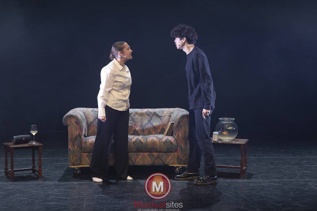De relatie tussen Timo en Izabel vormt het emotionele hart van de voorstelling. Hun scènes zijn pijnlijk herkenbaar in hun kilte en machtsspel. Izabel is geen eendimensionale antagonist, maar een verstikkende aanwezigheid die zorg en manipulatie naadloos in elkaar laat overlopen. Wanneer zij de guppy’s doodt — Maximum en Minimum, Timo’s morele stemmen — wordt dat een ijzingwekkend kantelpunt. Niet alleen voor Timo, maar ook voor het publiek, dat plots beseft hoeveel begrip het al heeft opgebouwd.