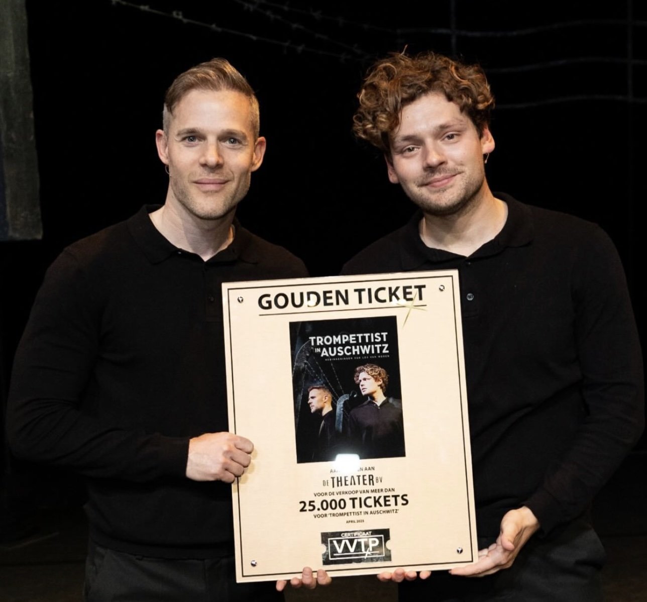 Acteurs Soy Kroon en Thomas Cammaert ontvingen vanavond in Schouwburg Amstelveen de VVTP Gouden Ticket Award voor meer dan 25.000 verkochte tickets voor de toneelhit Trompettist in Auschwitz. De cast kreeg de award na afloop van een uitverkochte voorstelling uit handen van producent Christian Seijkens.