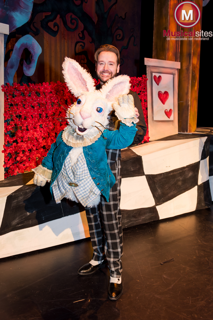 Wesley de Ridder verwarmt het hart met zijn vertolking van het altijd gehaaste Witte Konijn. Hij vliegt letterlijk van hot naar her over het toneel, waardoor je volledig gelooft dat hij eigenlijk geen tijd heeft om daar te staan. Zijn energie is aanstekelijk en zorgt voor veel vaart en speelsheid in de voorstelling.